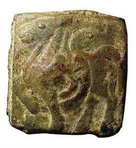 白色马金币,正方形,边长3.1厘米,(见下图)。币面铸马,头长瘪,颈项粗壮,胸肌凸鼓,腹紧臀圆,腕细蹄大,与骠骑将军霍去病墓前所刻的“马踏匈奴”石像相若。(见下图63)