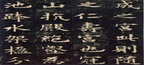 欧阳询融汉隶、晋楷、六朝碑书于一体的高华庄重、法度森严的“欧体”。《九成宫醴泉铭碑》乃欧阳询七十五岁所写,用笔方整,结构严谨,尽显欧书结构布置精严、圆润中见秀劲之特点,全碑无一笔松懈,更无一处紊乱,乃欧阳询登峰之作,明赵涵于《石墨镌华》评此碑为“正书第一”。易元树大师说:“此碑为后世学书者奉为圭臬,旧拓虽多,而善本极少。今日,我辈幸甚,良工旧拓,又有影印,多可展观,通过选本、照相、制版、用纸、印刷、装帧,在世人面前。”因此今日才能一饱眼福!