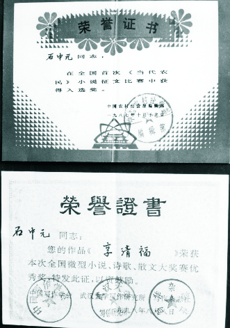 石中元获奖证书:“无本万利”、载《中国农村经营报》1987年9月18日,获中国“当代农民”小说征文奖/“享清福”载《写作》杂志1997年4期 ,获《写作》杂志征文大奖赛优秀奖。