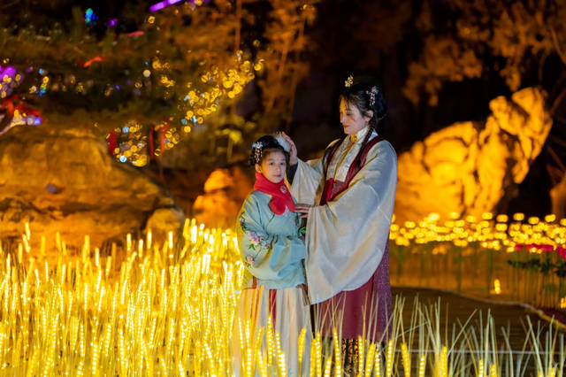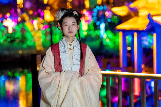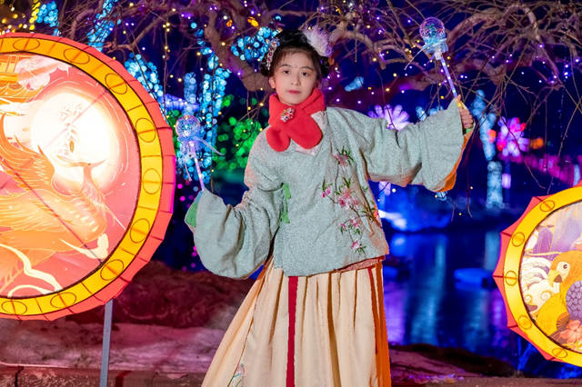 活动现场,几位身着汉服的女士成为了众人关注的焦点。她们在璀璨的灯光秀中穿行,古色古香的服饰与新春花灯相映生辉,让人有种穿越时空的错觉。
